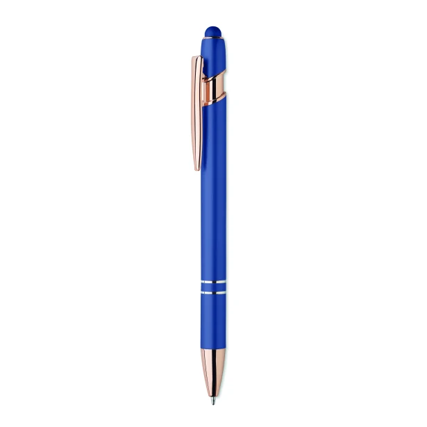Aluminiowy długopis z rec. Scribble to propozycja dla firm, które chcą pokazać klasę bez nadmiaru fajerwerków. Niebieski, satynowy korpus zwieńczony dwoma pierścieniami i klipsem w odcieniu rose gold błyszczy dyskretnie niczym spinki do mankietów prezesa. Dzięki lekkości (około 18 g) i zgrabnym wymiarom Ø1 × 14,3 cm pisze się nim pewnie nawet podczas trwającego kilka godzin kongresu. Wkład z niebieskim tuszem został dobrany tak, aby w 9 na 10 biznesowych przypadków pasował do firmowych druków, ankiet i papieru firmowego.
