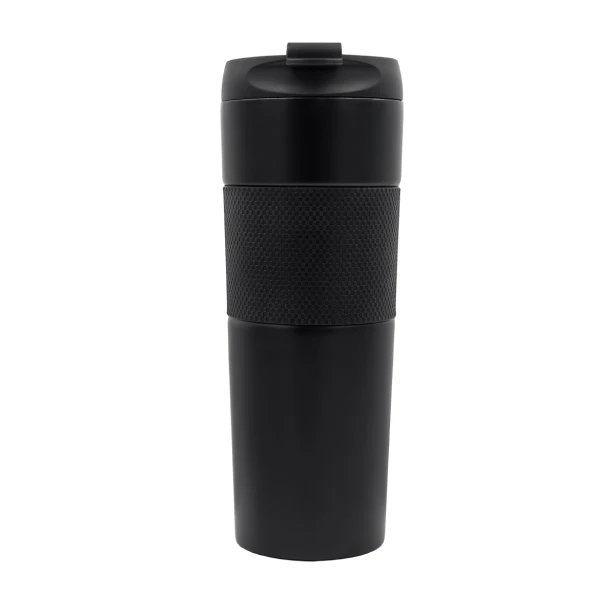 Serce kubka stanowią podwójne ścianki ze stali nierdzewnej 18/8, znanej z odporności na korozję i neutralności smakowej. Między nimi znajduje się próżnia, która tworzy barierę termiczną – temperatura napoju spada poniżej 40 °C dopiero po sześciu długich godzinach. Z zewnątrz czeka Cię matowe wykończenie klasy premium; na środku antypoślizgowy pas z drobną fakturą pewnie leży w dłoni nawet wtedy, gdy wysyłasz w biegu kilkanaście maili. Całość wieńczy pokrywka z blokadą wycieku – wystarczy jedno kliknięcie, by uniknąć niespodzianki w torbie z laptopem.