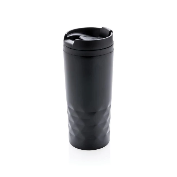 Wyobraź sobie konferencję, na której na stole prelegentów stoją identyczne, niebieskie kubki z geometrycznym wzorem, wszystkie subtelnie oznaczone laserowym logo Twojej marki. Świadczy to o spójności wizualnej i dbałości o szczegóły – a to właśnie te detale budują wizerunek profesjonalisty. Kształt przypominający szlifowany kamień ułatwia pewny chwyt, nawet gdy sala jest pełna i trzeba szybko przejść z miejsca na miejsce. W środku wysokogatunkowy plastik separuje dłonie od gorącej powierzchni i pozwala utrzymać temperaturę napoju do około 4 godzin, więc Twój partner biznesowy zdąży przejść przez co najmniej dwie prezentacje, zanim poczuje potrzebę dolewki.