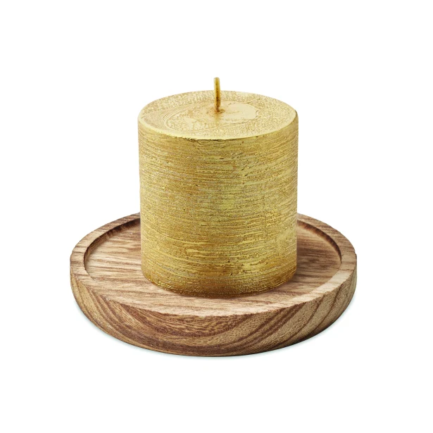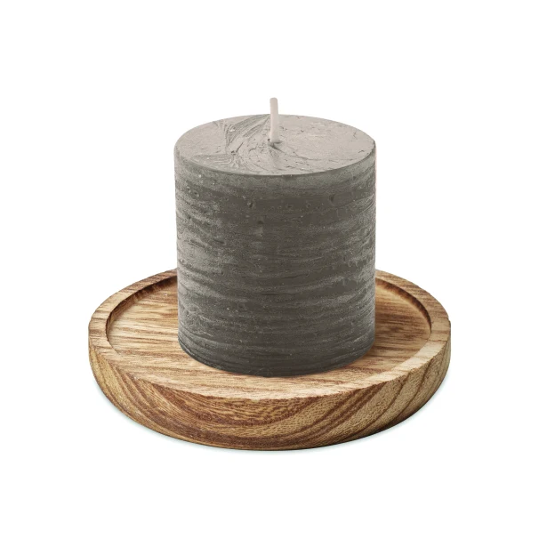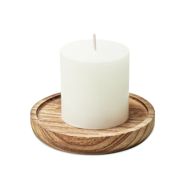 Walec o średnicy dziewięciu centymetrów nie tylko wygląda stabilnie – on jest stabilny. Szeroka baza sprawia, że świeca nie chwieje się przy przenoszeniu, a drewniana podstawka chroni blat przed gorącym woskiem. Dzięki temu obdarowany nie musi się martwić o podkładki czy talerzyki, co dodatkowo podnosi praktyczną wartość prezentu.